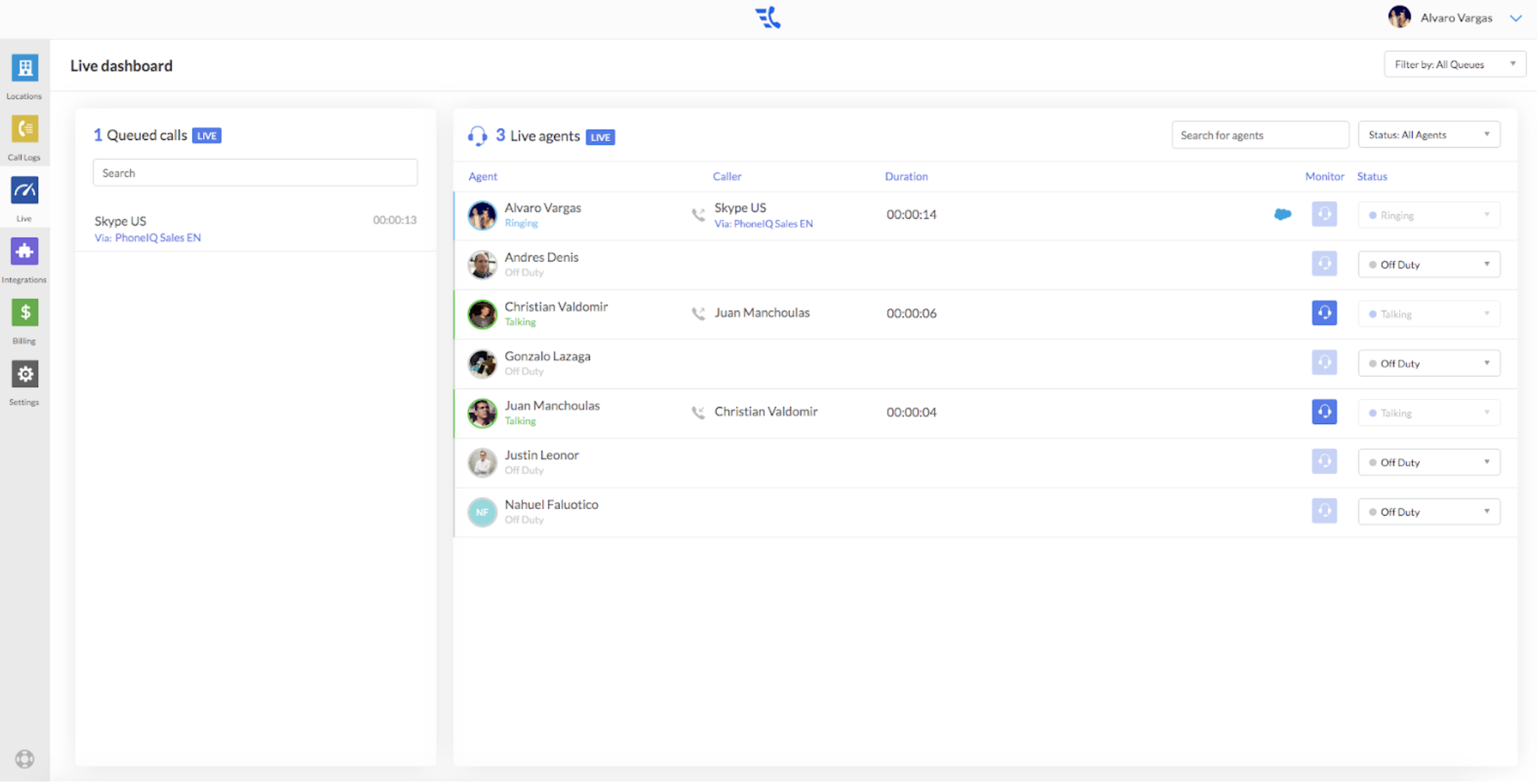 4. You may want to change the status of your agents if they forget to switch it themselves (e.g.: an agent leaves the office and left her status as “In Service”). Using the Live Console, supervisors can easily switch their status between Off Duty and In Service.