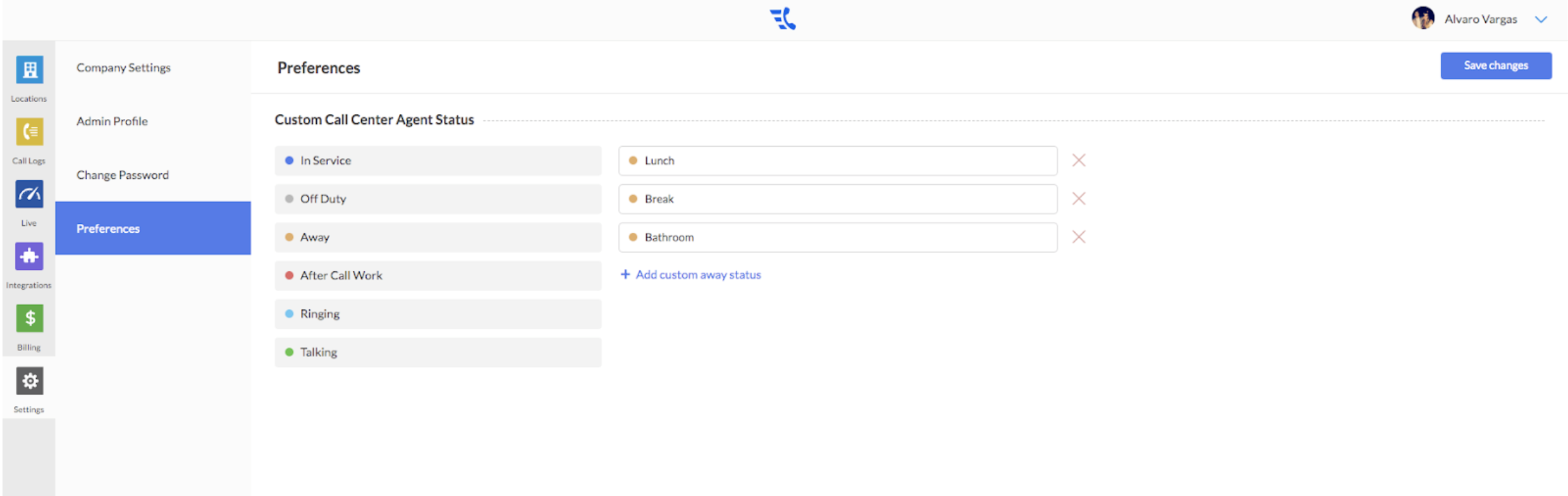 If supervisors require that agents describe why they are setting themselves away, they can use custom away statuses to create custom dispositions such as: Break, Lunch, Bathroom, etc.